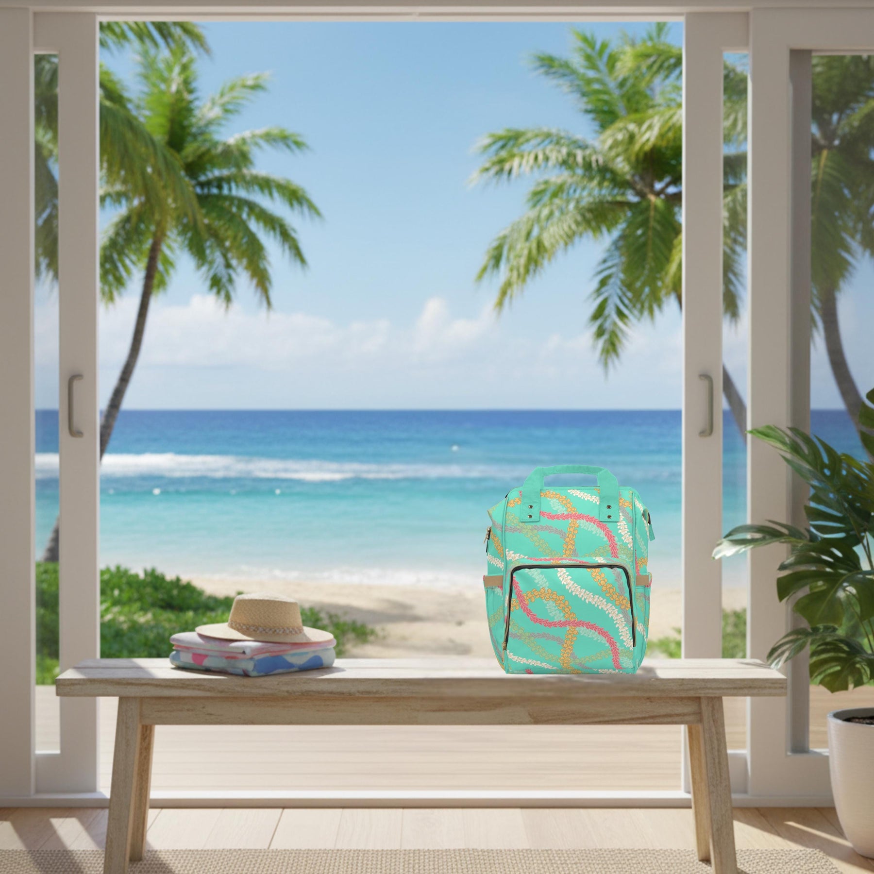Whether you’re heading to the park, running errands, or traveling, this floral diaper backpack keeps your essentials organised and within reach while adding a touch of tropical elegance to your daily routine. The Hawaiian lei diaper bag combines practical design with beautiful island style, making it an excellent choice for moms who want both utility and fashion in one versatile bag.