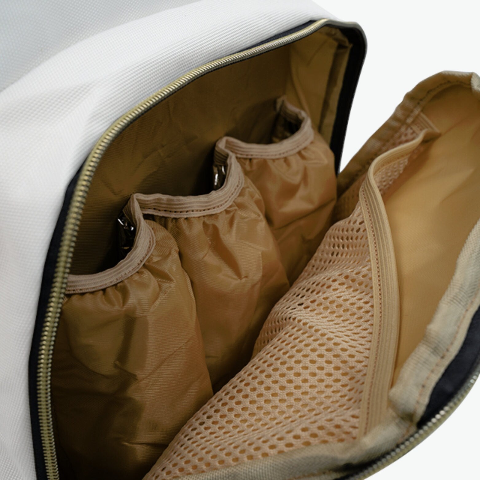 Featuring adjustable shoulder straps diaper bag style and a padded back panel, this stylish diaper bag ensures comfortable wear throughout the day. The cream interior lining adds a clean look while making it easy to find items quickly. With one main zippered compartment, four elastic pockets inside, two outside pockets for water bottles or small items, and additional zippered pockets front and inside, this spacious baby bag compartments system keeps your essentials organised and accessible.