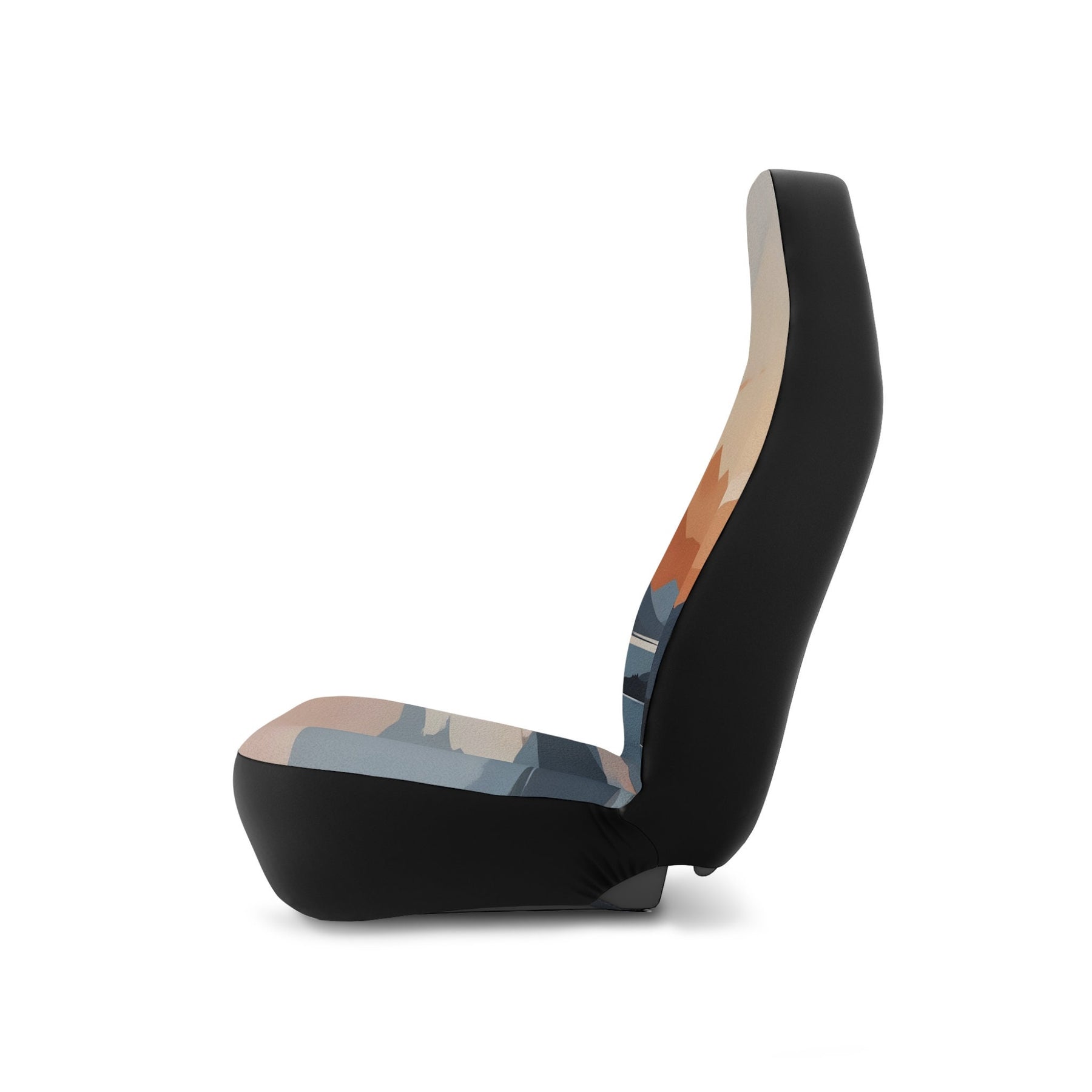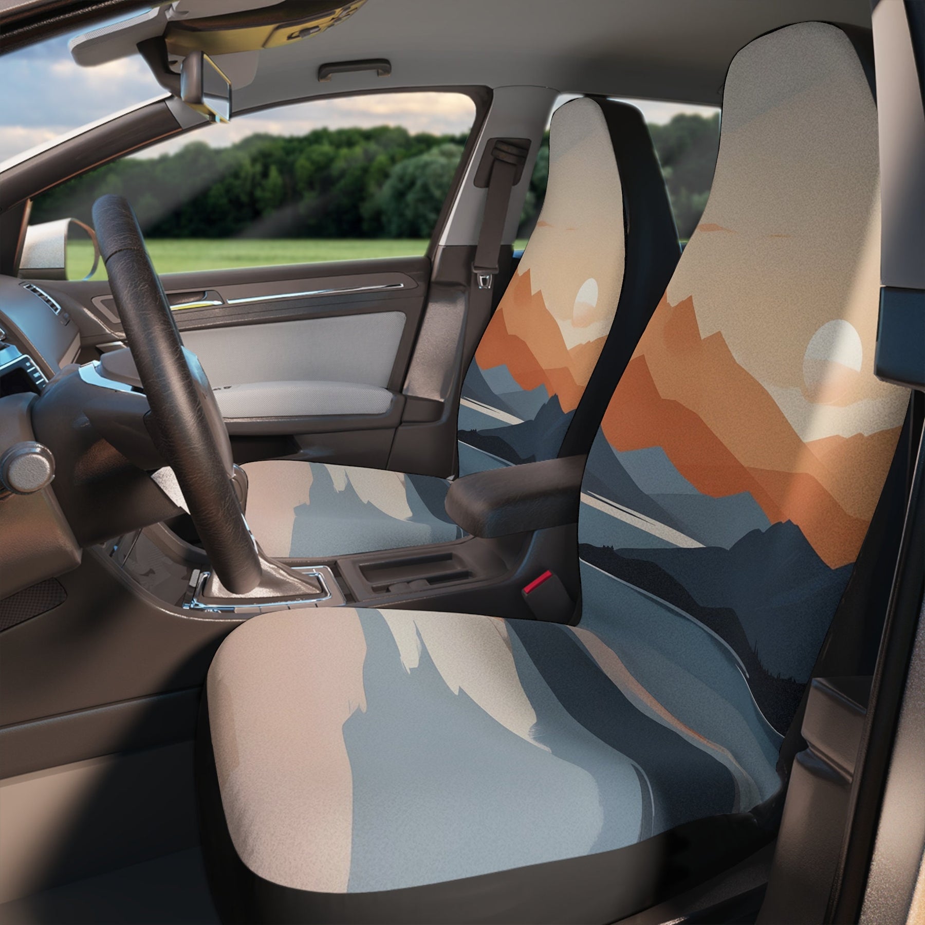 Our retro car seat cover brings vibrant 70s bucket seat style and durable protection to your vehicle, perfect for adding personality and safeguarding your seats during every road trip. Designed as a colorful seat cover with a groovy vibes design (featuring mountains and abstract sunset), this set of two covers is the perfect upgrade for your car, van, camper-van, or truck.