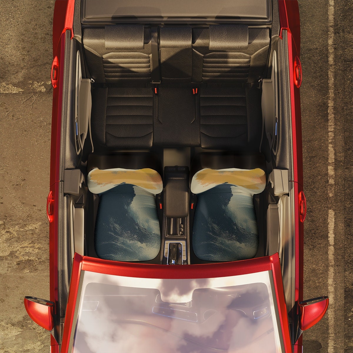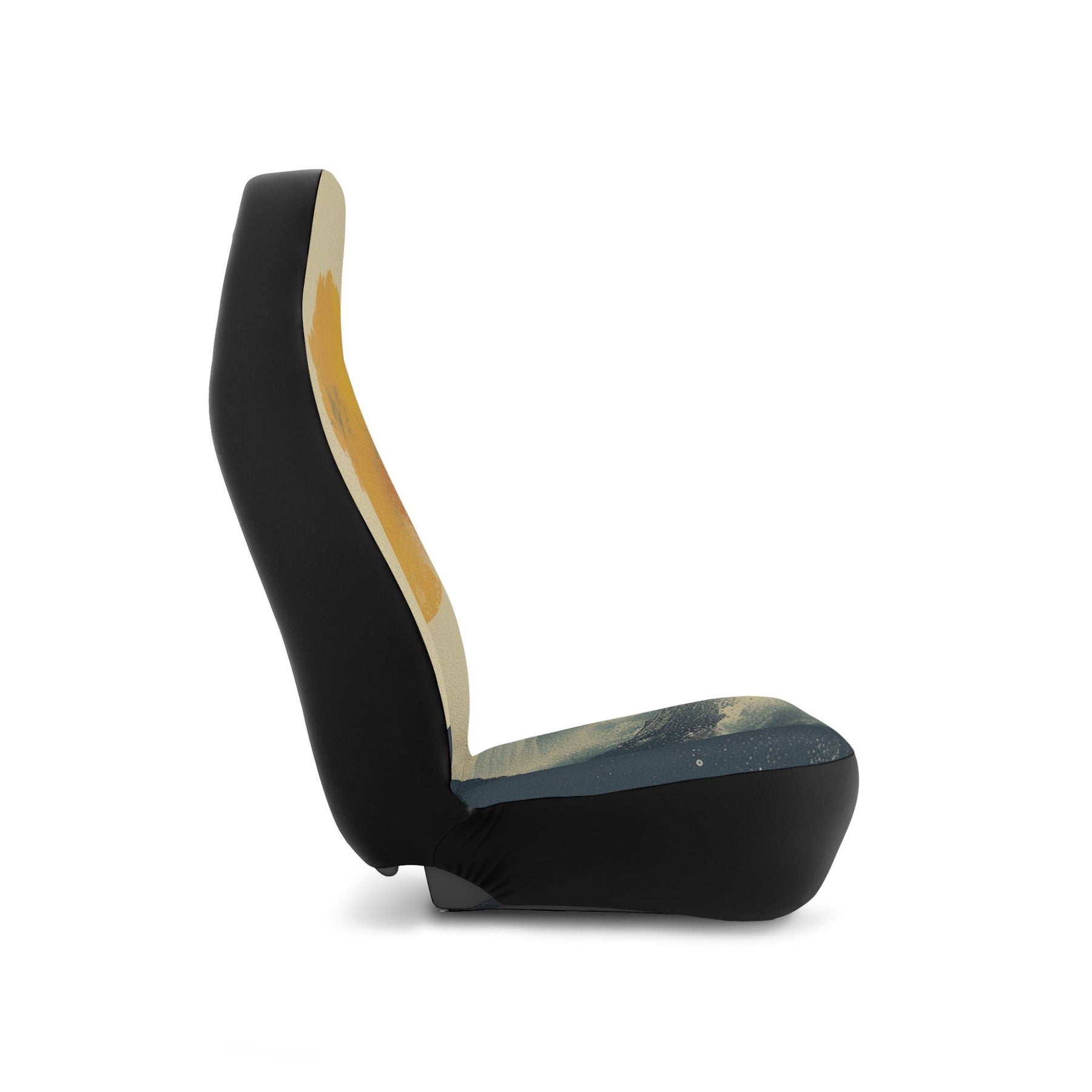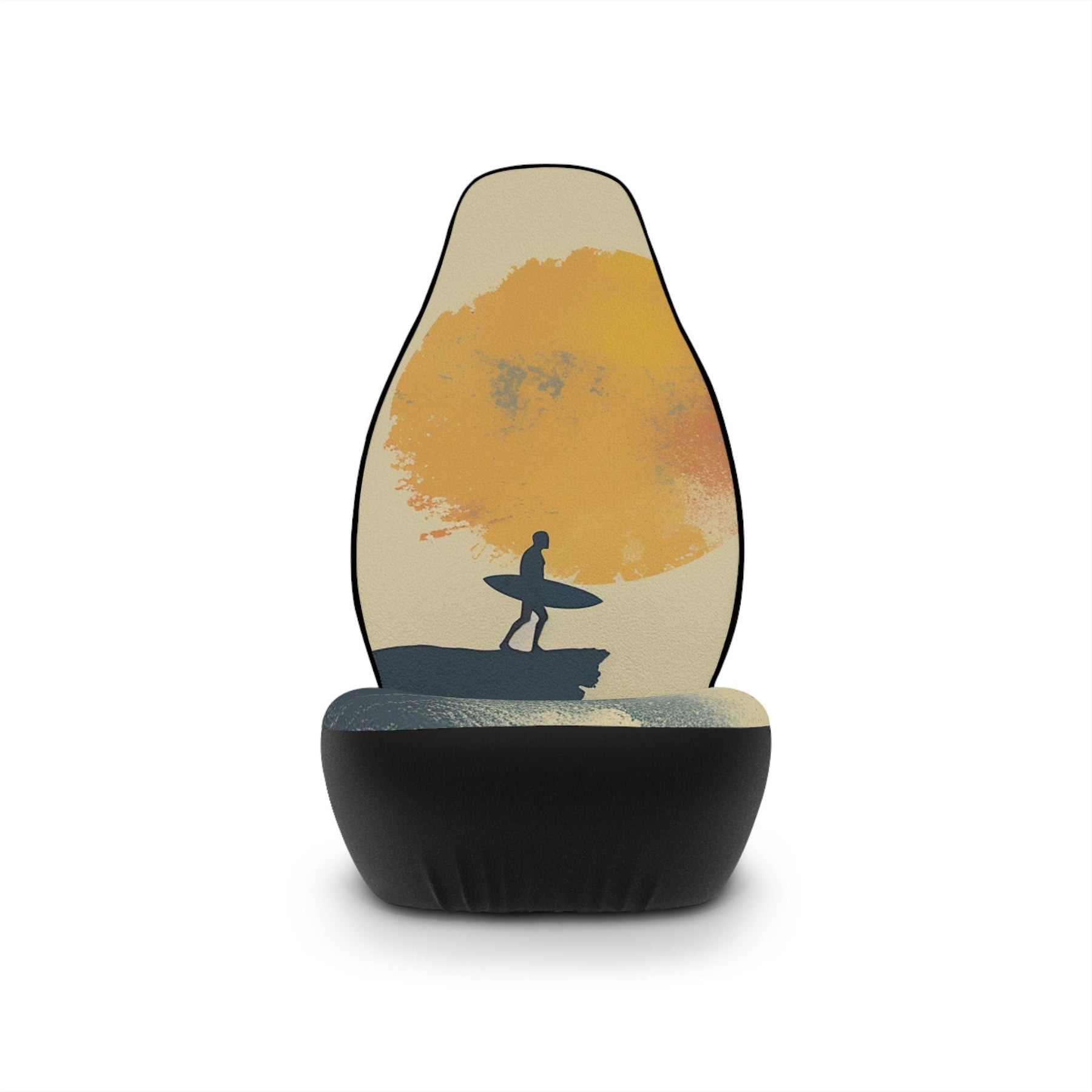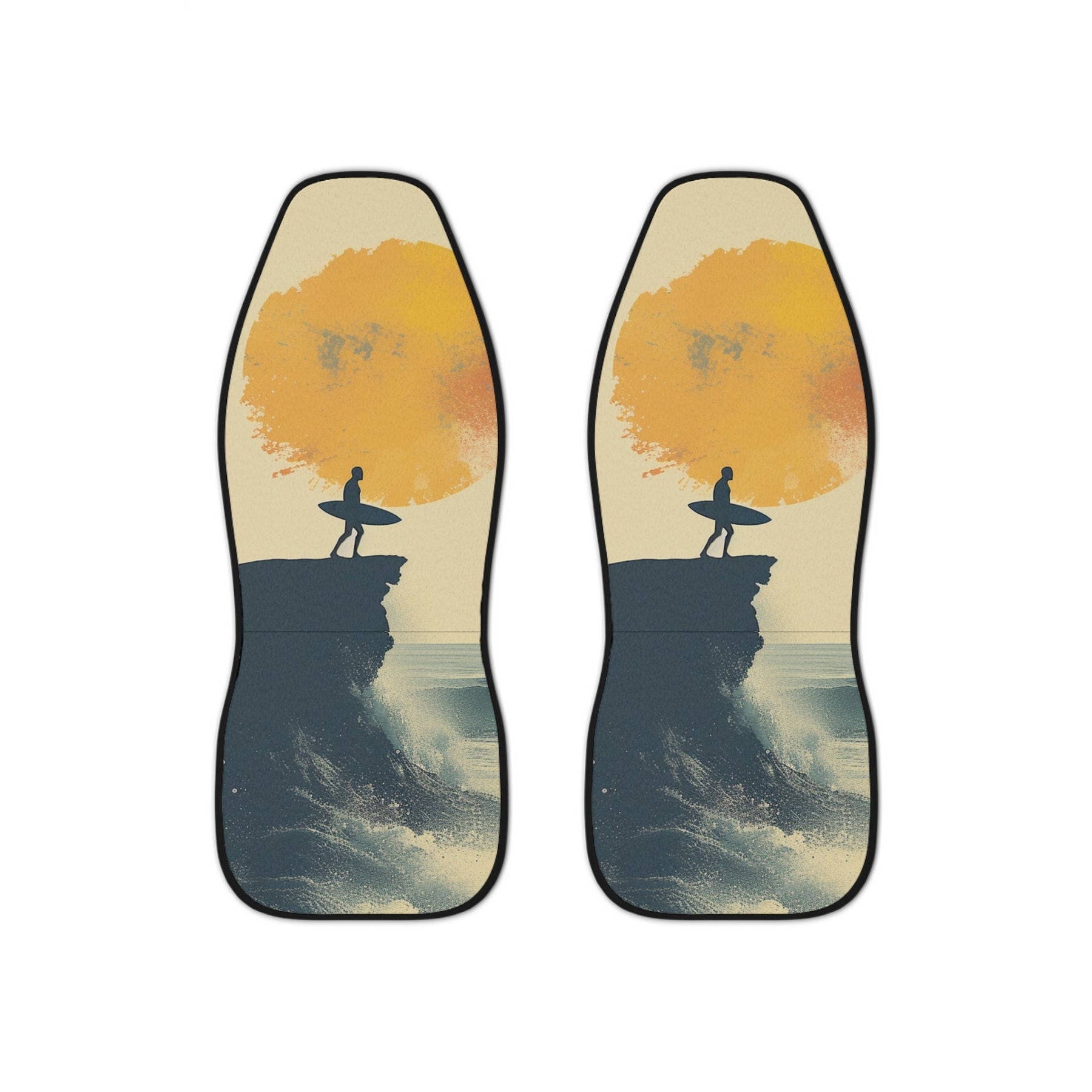 - Abstract Surf Design: Features a unique abstract print seat covers design with a surfer, waves, and golden sun, capturing a calming beach theme.