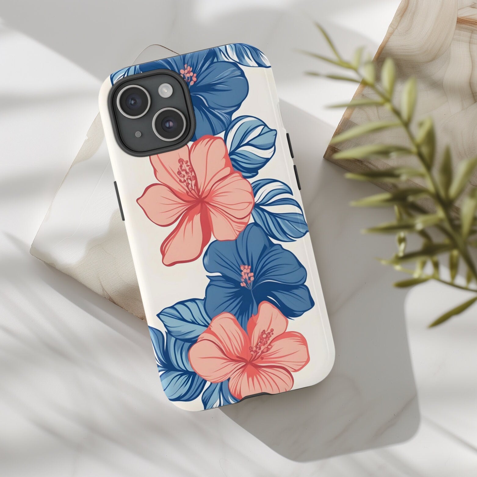 This tropical phone case features a Hawaiian floral case design printed with UV-resistant ink. It is fully wireless charging case compatible.