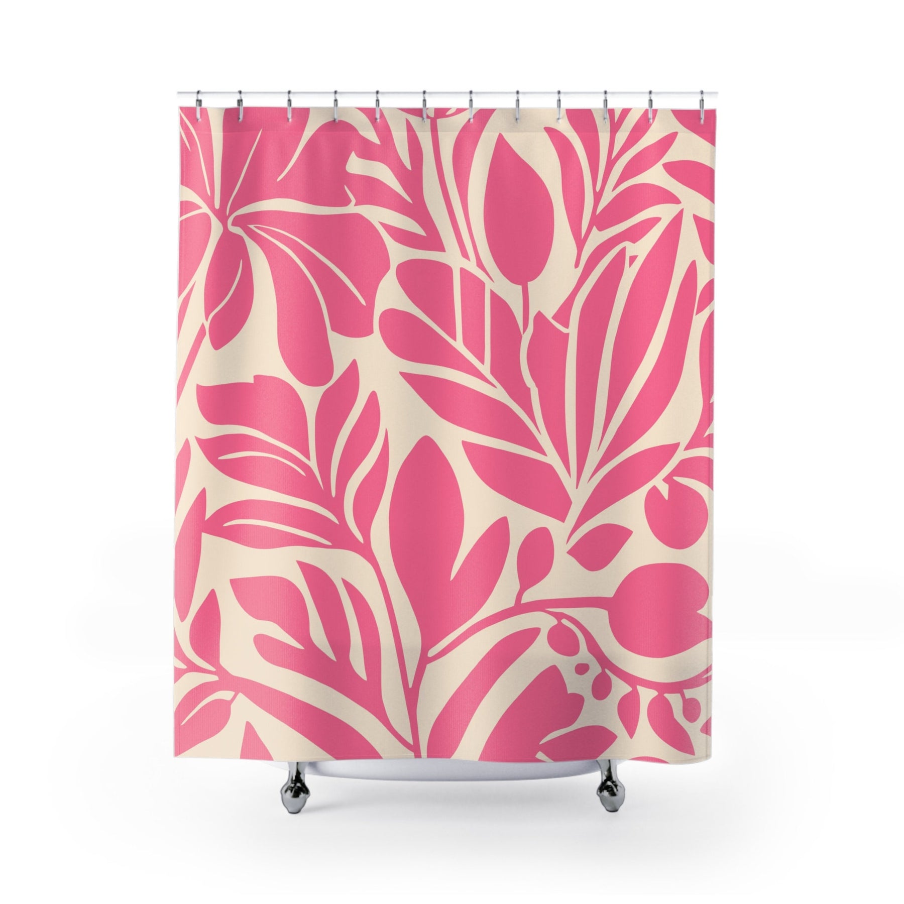 The Little Cove Shower Curtain is a vibrant tropical shower curtain designed to transform your bathroom with its lush pink botanical prints and bold design. Inspired by the artistry of Matisse, this pink floral shower curtain combines artistic style and essential function to bring aloha bathroom curtain vibes and endless summer feelings into your home.