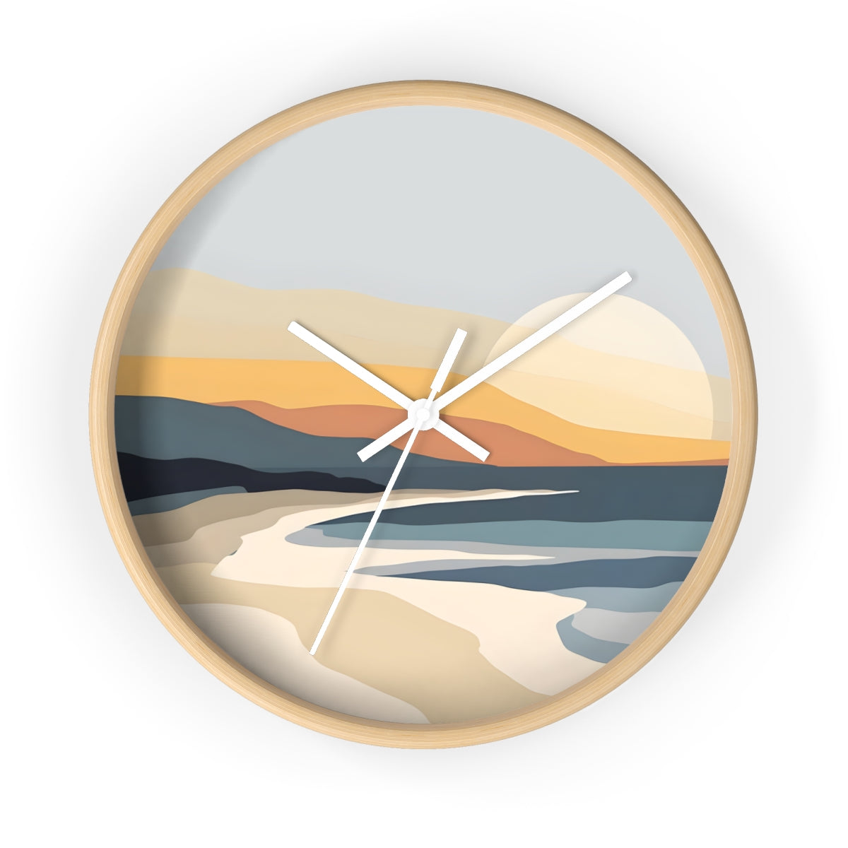 The Laguna Beach Wall Clock brings timeless coastal charm and minimalist elegance to your home, offering a serene beach house clock. This coastal wall clock features a boho pastel clock face depicting a stunning mountain sea decor scene.