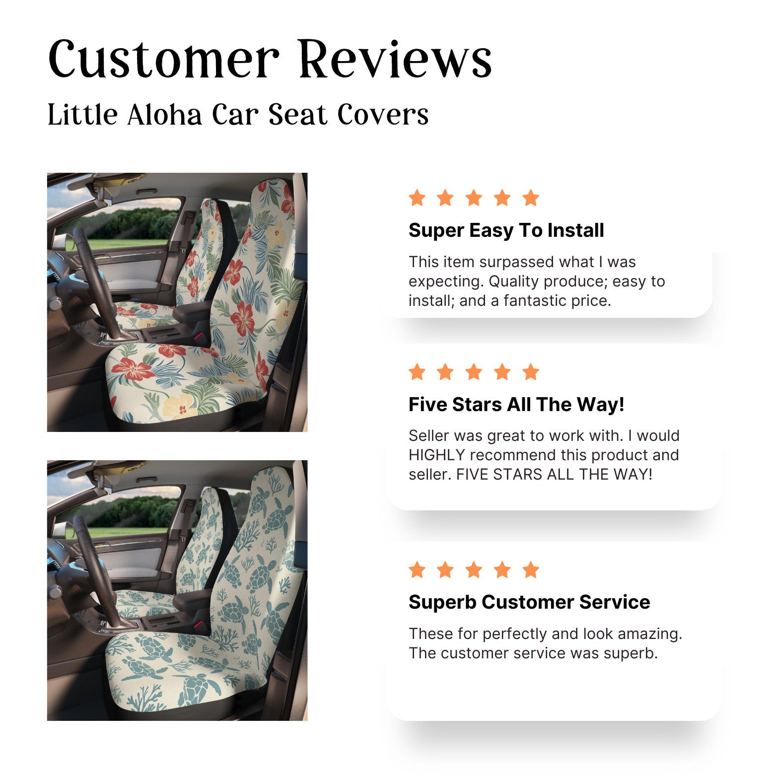 - Custom made seat covers crafted upon order to reduce waste and support eco friendly choices