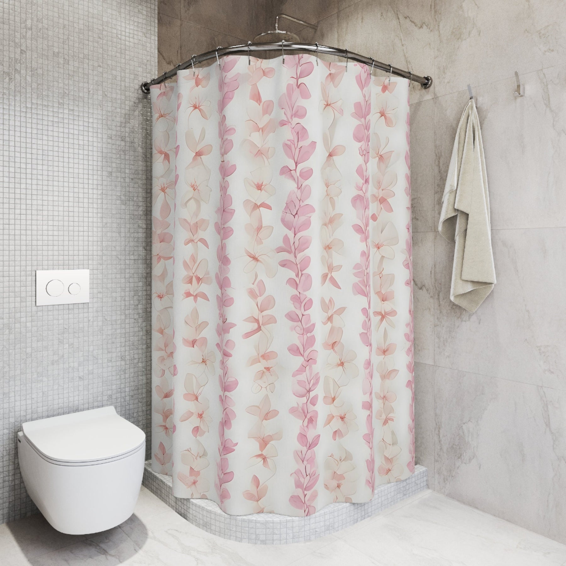 This floral shower curtain brings vibrant tropical island vibes right into your bathroom, featuring a stunning plumeria print curtain that captures the essence of Hawaiian flower lei tradition. Designed as a waterproof bathroom curtain, it combines style and practicality to brighten your space while protecting your floors from moisture. Perfect as a housewarming bathroom gift or to enhance your boho chic bathroom decor, this easy clean shower curtain offers lasting beauty and function.