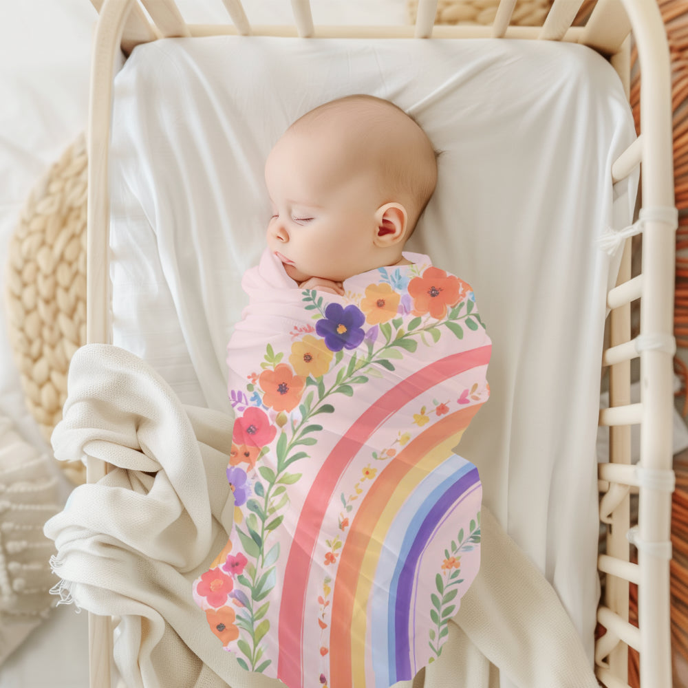 The Rainbow Bay Baby Blanket is a premium baby swaddle blanket designed to keep your newborn cozy and secure while showcasing a vibrant floral rainbow design. Crafted from 100% jersey polyester, this breathable baby fabric ensures softness and comfort against delicate skin.